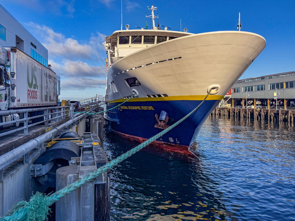 Spotted on the Seattle Waterfront. The National Geographic Cruise Ship the National Geographic Venture while it was preparing to venture to adventure. That's pretty cool.